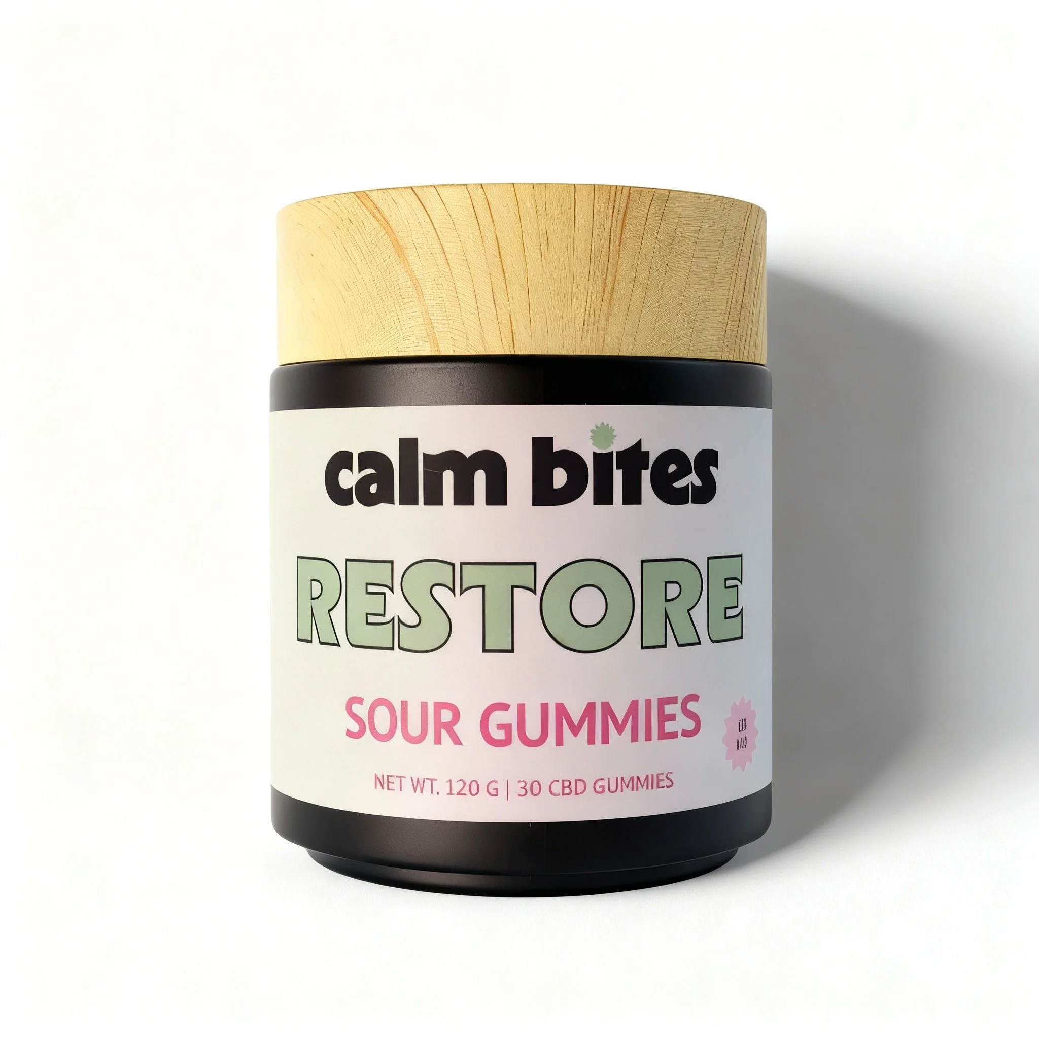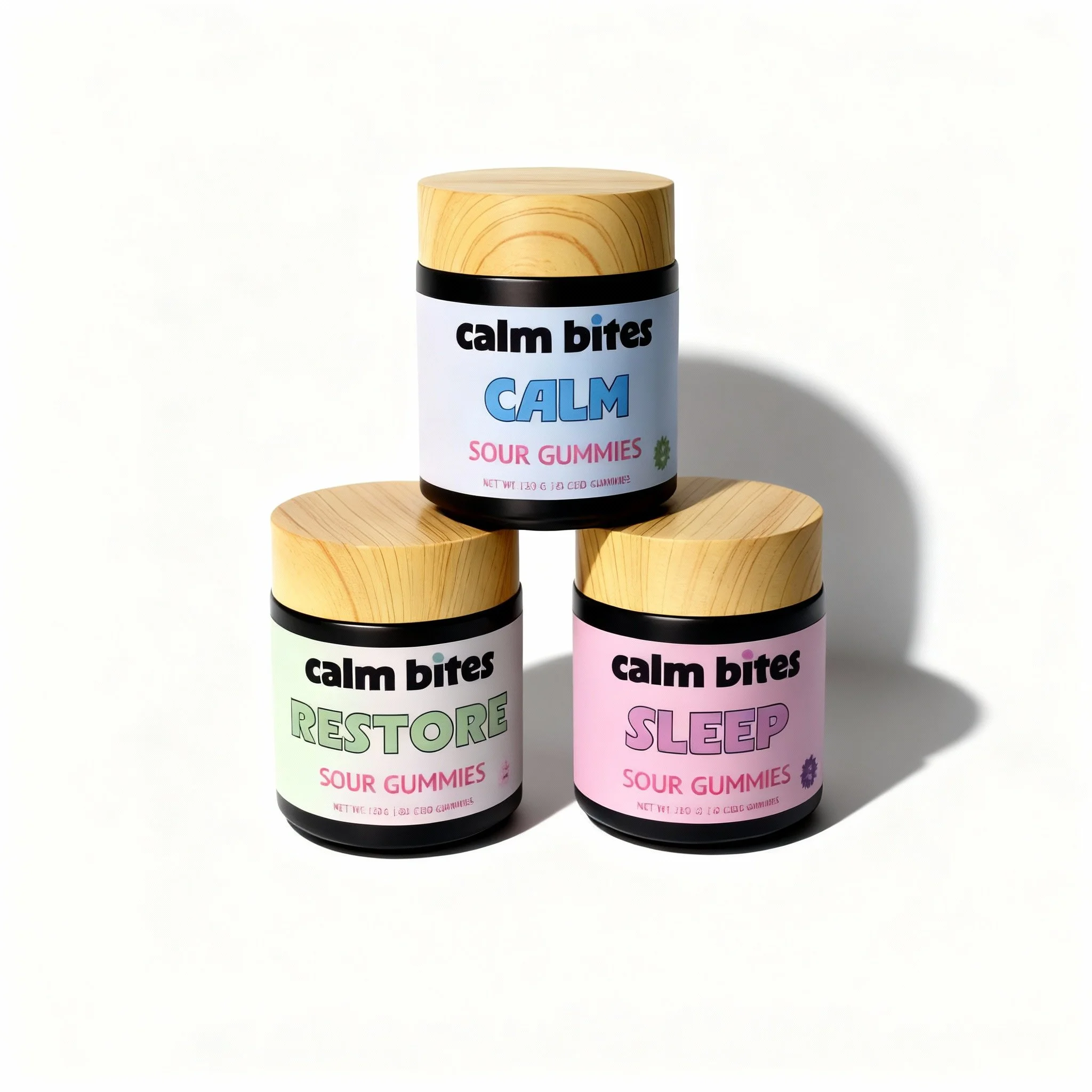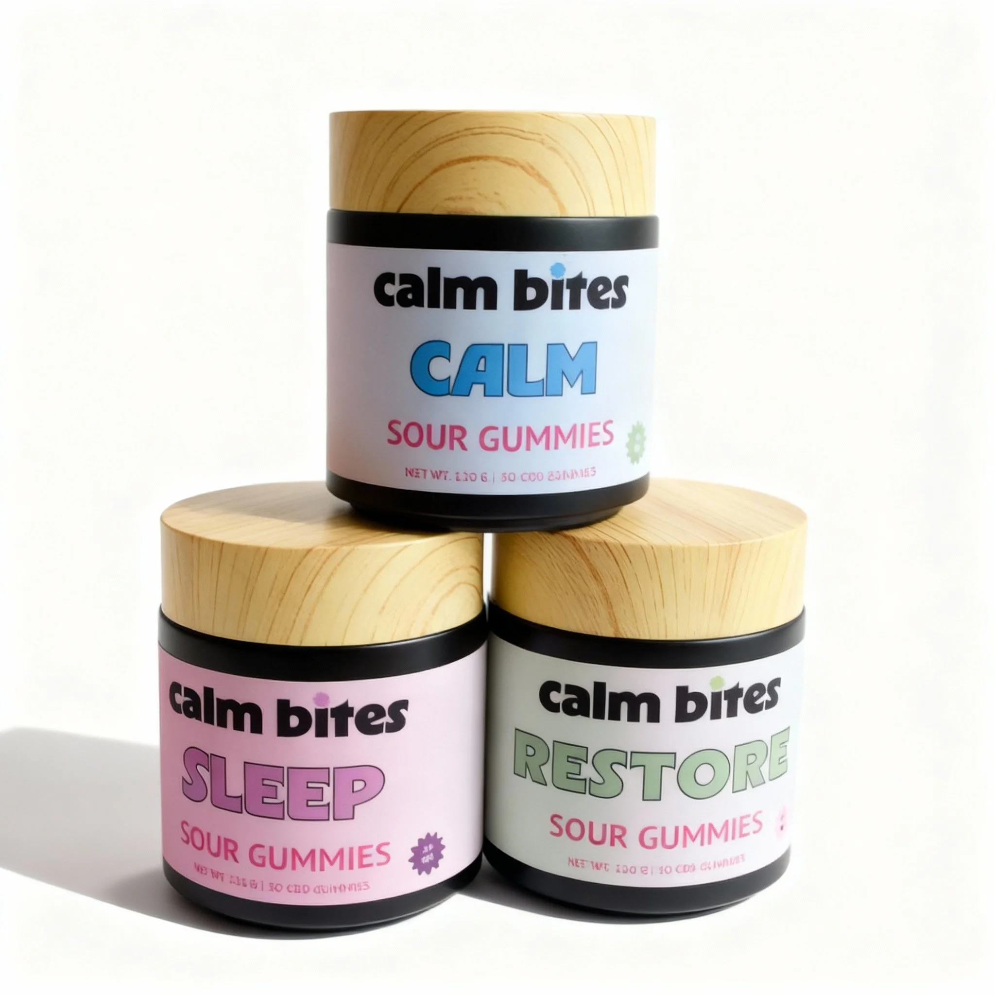 Calm Bites are a line of CBD gummies designed to make wellness approachable. The branding emphasizes calmness through clean typography, soft palettes, and tactile packaging that feels trustworthy.